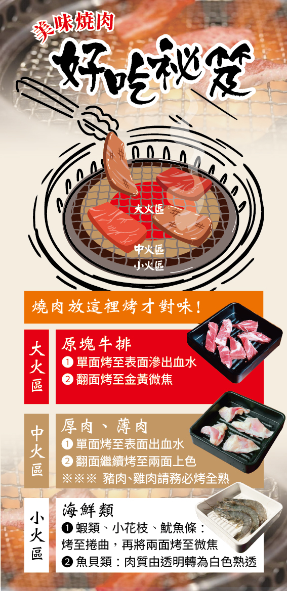 不同食材建議擺放在不同區域是燒烤美味關鍵。 掌握燒烤三區火力,對食材分區烤,熟度剛好、風味升級!