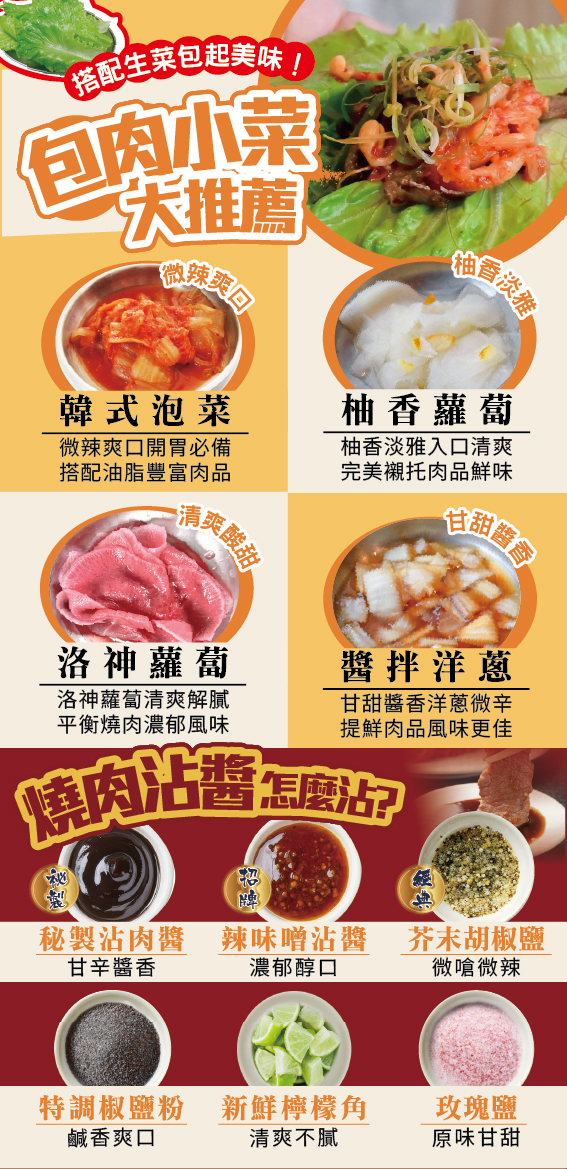 燒肉搭配小菜沾醬,解膩提香、層次升級,打造味蕾的黃金拍檔!
